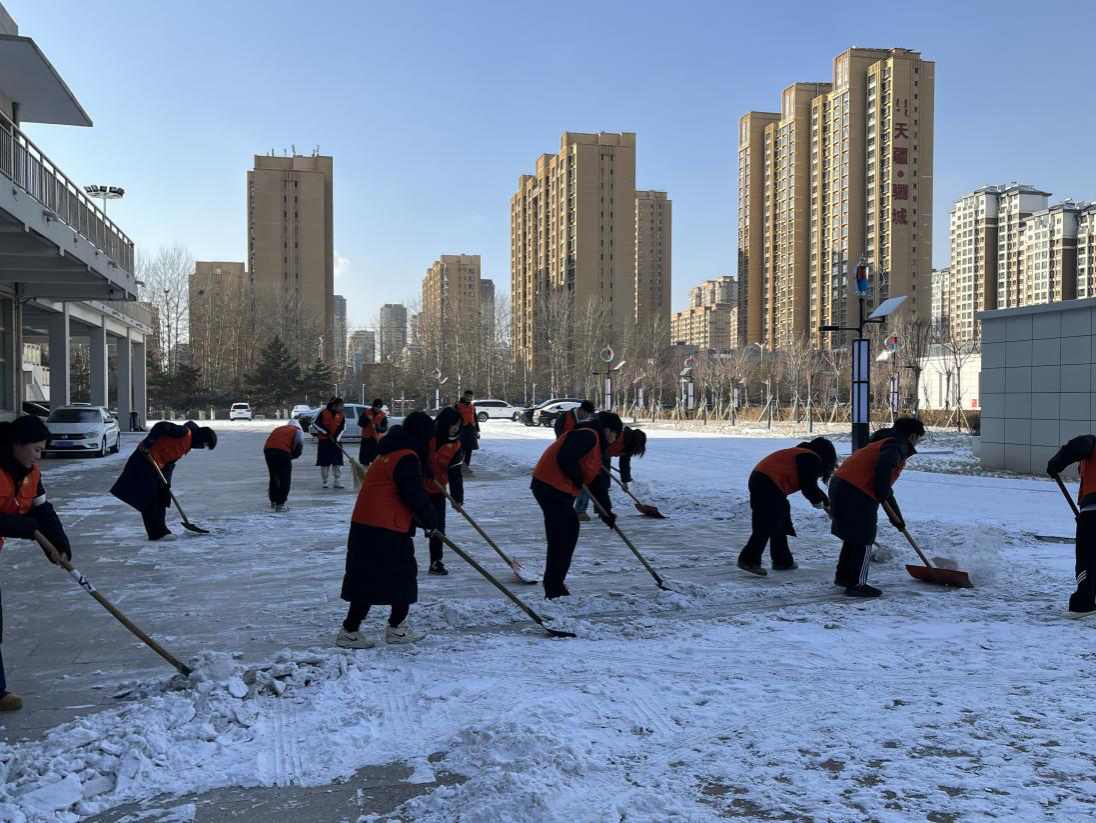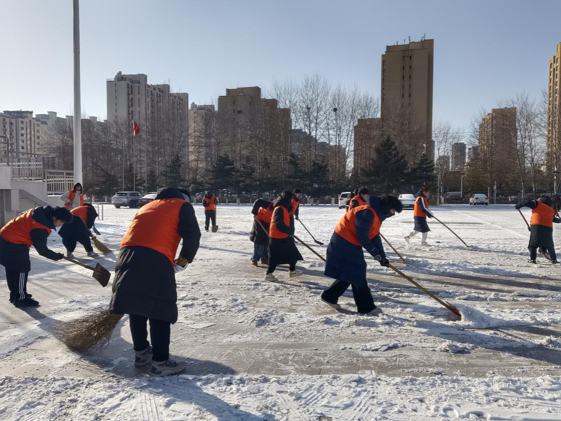 同学们按照预先划分的责任区域,携带铁锹、扫帚、推雪板等工具准时集结。各小组分工明确,配合默契,清扫现场员工志愿者们干劲十足,有的奋力铲除冻结的厚冰,有的仔细清扫台阶残雪,有的负责将积雪清运至指定地点。尽管寒风刺骨,许多人的脸颊和双手被冻得通红,但劳动的热情丝毫不减。经过连续两个小时的奋战,完成体育馆周围主要干道、操场门口积雪清除任务。